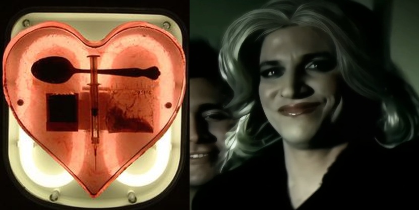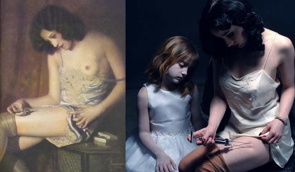 The scene of Dita VonTeese injecting her thigh with a needle is a recreation of the painting Dangerous Passion by Atelier Manassé.