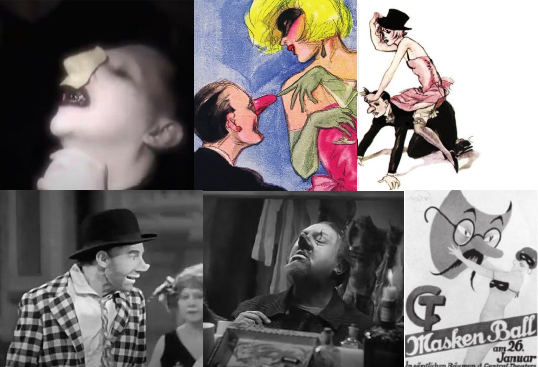 The image of Manson with a prosthetic nose is inspired by a common trope from cabaret and theater of depicting foolish and horny men with an elongated nose. It seems to be an allusion to an erection, perhaps in conjunction with the "lead by the nose" idiom. Examples of this used in non-horny contexts (general baffoonery), can be seen in the 1930 German film The Blue Angel, and the 1929 American film Applause.