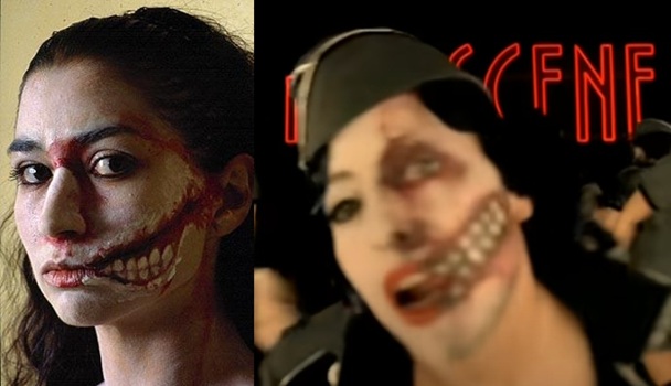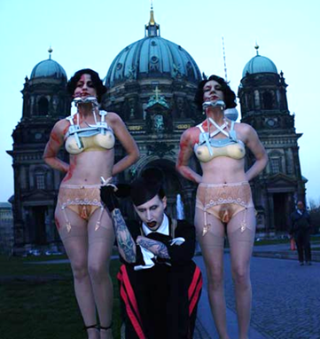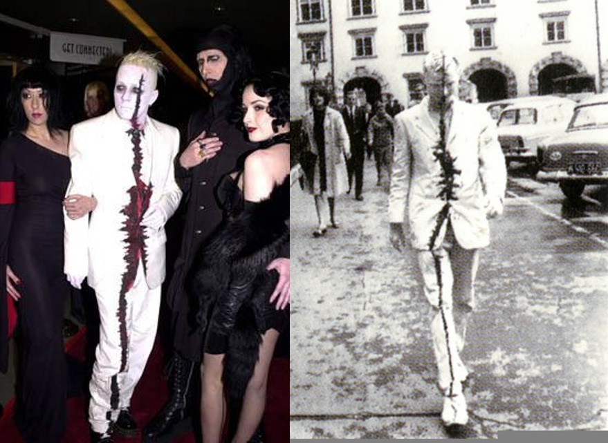 In a scene that features Manson with his band members John 5 and Tim Skold, Tim Skold's appearance is like a white canvas with a line drawn over it. This is the same outfit he was wearing for the premiere of the movie Resident Evil, which he and Manson scored, so since Doppelherz is a very dimly lit movie, for better visibility I will provide an image from the premiere instead of Doppelherz. This look is a recreation of Günter Brus' Vienna Walk, and Self-Painting, Self-Mutilation performance (these are two different performances, based on the same concept).