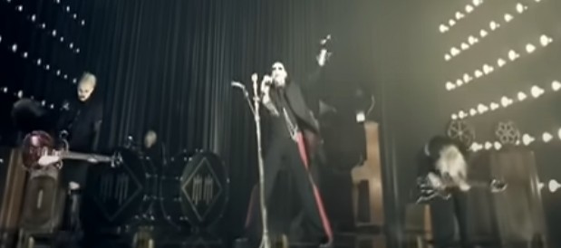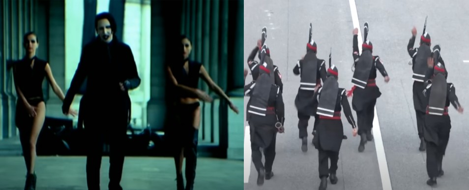 In this music video we see Manson arriving at a location, preparing for a show with the band, and then performing in front of an audience in a faithful recreation of his real live show for the era, with similar sets and costumes. The entire aesthetic of the video, and especially the live show, takes design cues from Nazi Germany: the Nuremberg rallies, the neoclassical architecture, and the military customs. At the end of the video a black face Mickey Mouse appears. For analysis of the live show aspects depicted in this music video, see the Tour section.