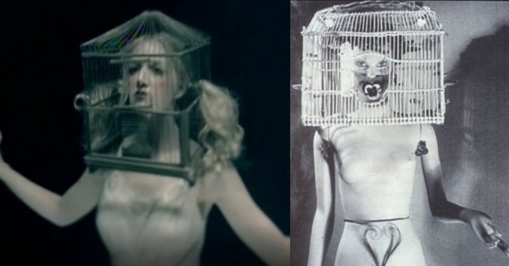 The woman with a bird cage over her head is a recreation of André Masson's Mannequin.
