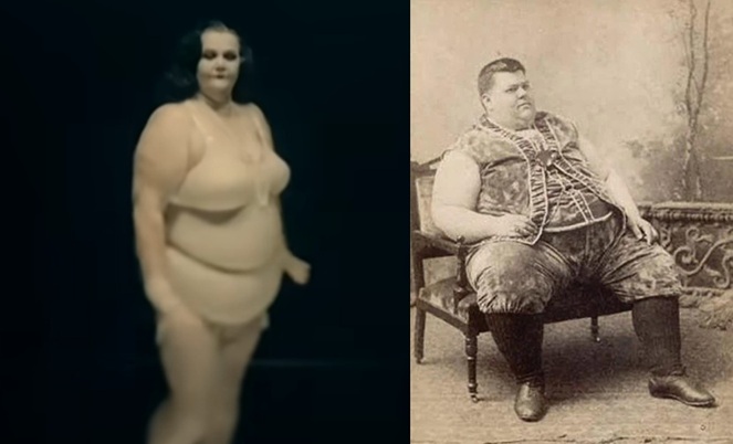 The fat woman, like the conjoined twins, represents another "human freak" worthy of being displayed in a 19th century circus show. If this sounds far-fetched, here she is contrasted with Chauncey Morlan, who was exhibited in circuses as the world's fattest man in the late 1800s. The notion of what constitutes "unusually fat" was very different in those days.