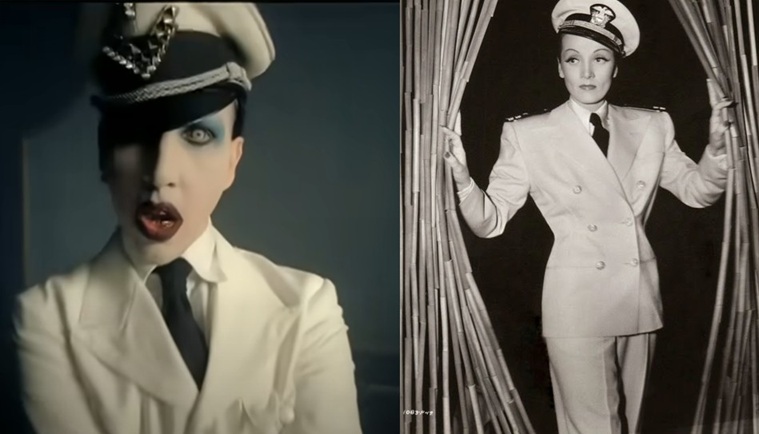 The picture of Manson wearing a navy suit is a tribute to Marlene Dietrich, who Manson referenced multiple times in the diary entries he used to write on his website during the making of the record.