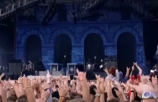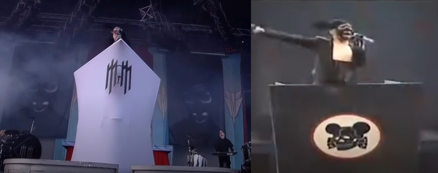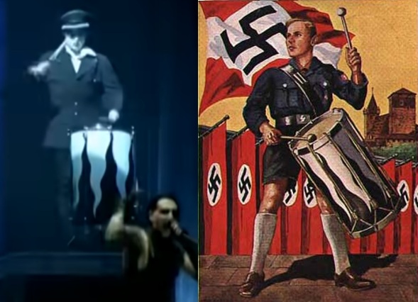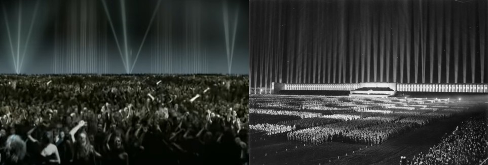 The spotlights in the Manson show (on the left) are reminiscent of the Cathedral of Light spotlights that were a feature of the Nazi Party rallies in Nuremberg.
