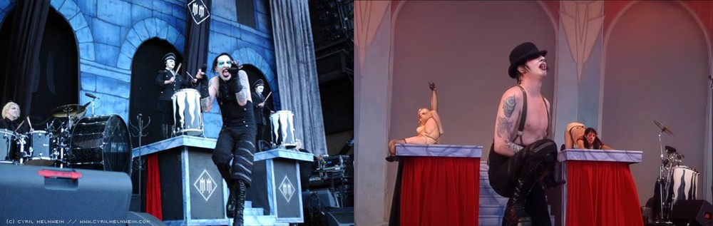 Other period specific gimmicks during the show happen during the performance of the title track, where Tim Skold plays an upright bass, the dancers pretend to play a piano, and Manson finishes by playing a saxophone in an offkey manner. This is the show's tribute to jazz, where an upright bass and saxophone are common instruments, and which predates electronic keyboards. During the performance of Sweet Dreams, we get a touch of decadence when Manson opens a bottle of champagne.